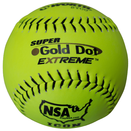 Worth’s Super Gold Dot 44/400 core 12″ NSA contains a polyurethane core to maintain ideal compression during hot weather games and practices. The NI12CY Softball features a bright yellow 12-inch SYCO composite leather cover for increased durability and visibility. The black raised seams help improve a player’s grip.